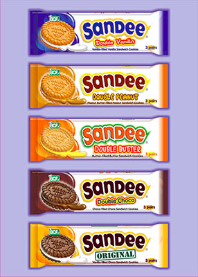 For the sweet tooth, SANDEE cookies are made available in sandwich form. The same delicious plain cookies Sandee has been known for is used and are filled with delightful creamy flavors of vanilla, chocolate and butter. Sandee Sandwich Cookies are available in four variants namely ‘Original’ (chocolate cookies with vanilla filling), ‘Double Chocolate’ (chocolate cookies with chocolate filling), ‘Double Vanilla’ (vanilla cookies with vanilla filling), ‘Double Butter’ (butter cookies with butter filling) and ‘Double Peanut Butter’ (peanut butter cookies with peanut butter filling). Sandee Sandwich Cookies are also available in a 10-pack bag of assorted flavors. .